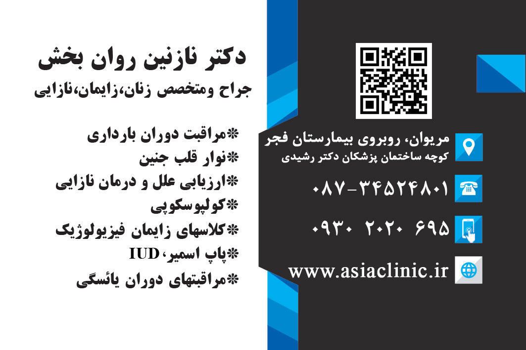 مریوان، روبروی بیمارستان فجر، جنب داروخانه دکتر سجادی ،پلاک 17 مطب دکتر نازنین روان بخش